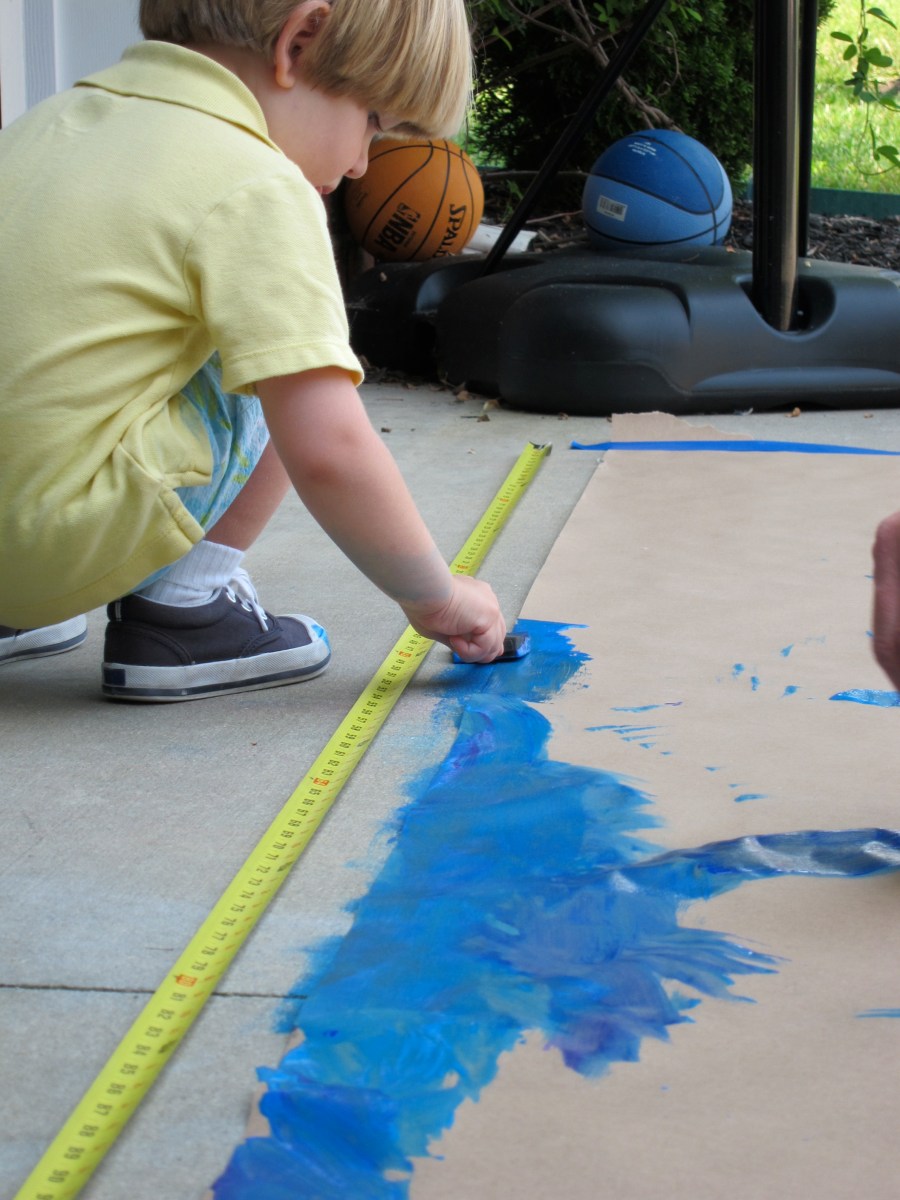 Painting the mural Published June 8, 2012 at 2112 × 2816 in There’s an Ocean in our House! Crowley paints the ocean blue. I left the measuring tape next to the mural so he can ‘participate’ in the math part of the project by creating a painting that will fit on our wall because it’s the right length!
