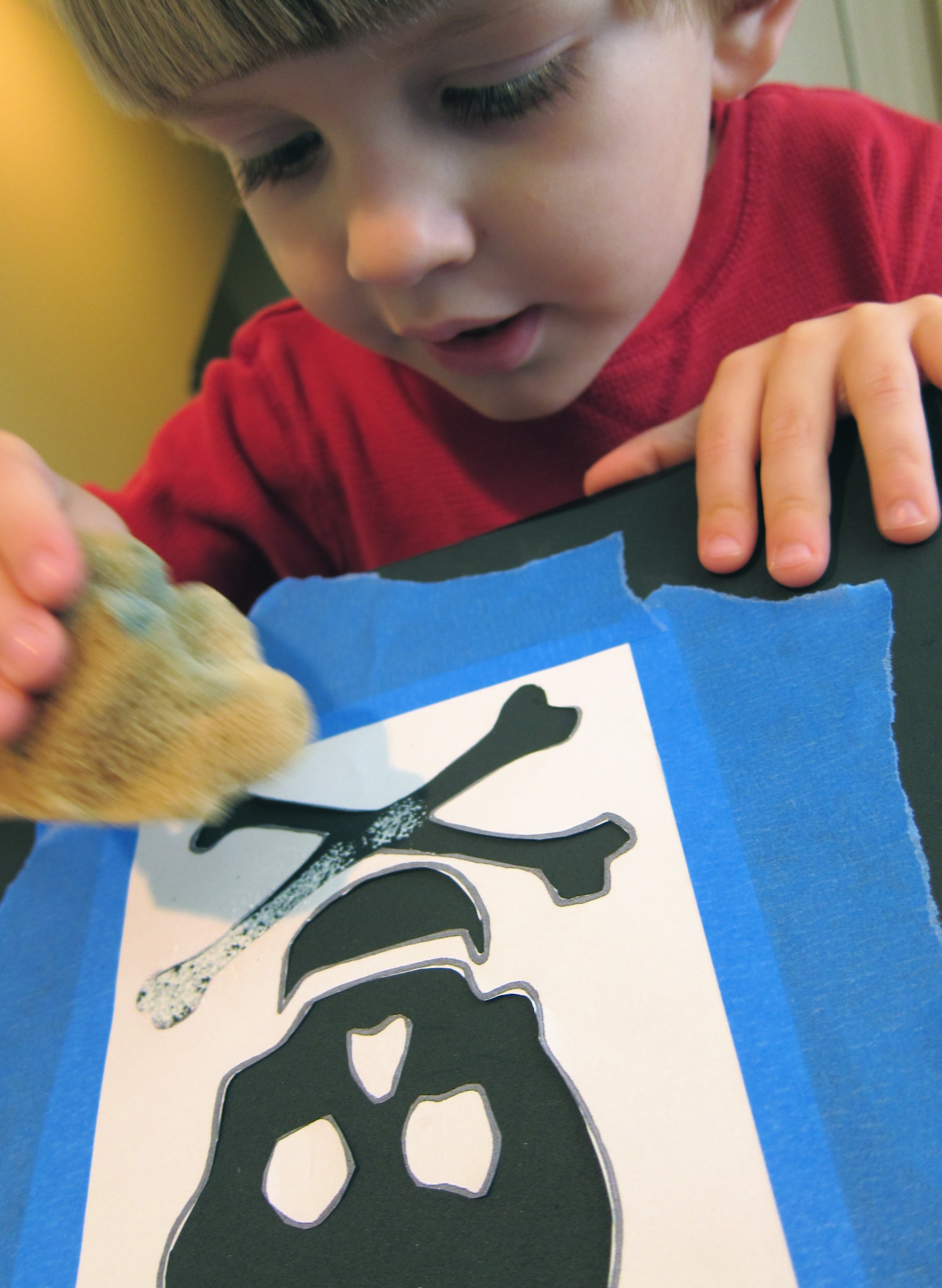 Crowley stenciled the skull and crossbones which was a GREAT exercise, learning to simply tap-tap tap. The Jolly Roger was intended for a pirate hat. When placing said hat on Crowley’s head, it ripped and was ruined. That was not a moment of greatness. But I’ll get to an easy, easy pirate hat idea (that does work) this week! Enjoy!