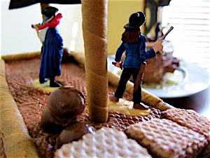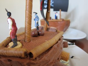 A couple of things I did differently. Instead of using skewers alone for the masts, I put the skewer through the center of long wafers. Hidden inside the cake, the skewers attach the mast to the ship.