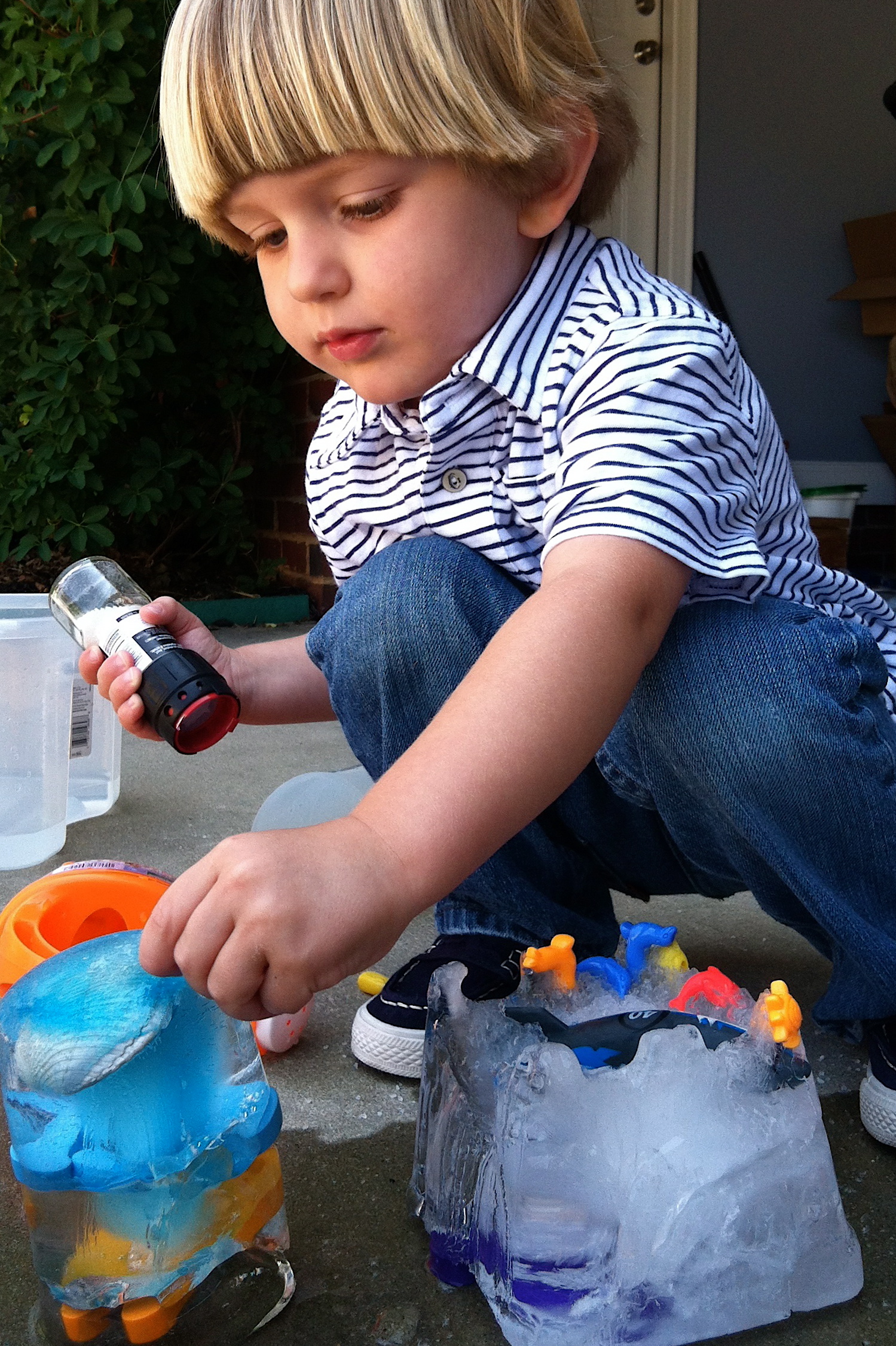 Then I handed Crowley a bin full of warm water, two jumbo plastic syringes (not the needle kind – just for the record) to squirt the ice with the warm water, and a bottle of grinder sea salt. His job was to free the objects trapped in the ice. No chipping. No hammering. Just melting. A particularly awesome activity having just viewed Happy Feet 2 last night!