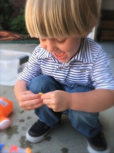 For some reason, for this age, colored anything is interesting. Eventually, I added red food coloring to the bin of warm water, which made it 1000 times more interesting to a 3-year-old. And so Crowley set about freeing his toys and sure enough… an HOUR and a HALF went by before I had to bring our fun to a close to serve lunch!