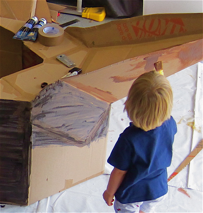 Bowsprit Published July 8, 2012 at 849 × 888 in Prepare to be Boarded! Arrrgh! – Part 1: Building a Pirate Ship Attaching the bowsprit was easy. Just let the box flaps rest flat on hull and tilt to desired angle. We taped it in place and then sliced off half the box.
