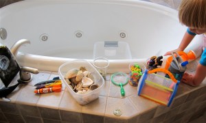 If it’s sunny at your house, feel free to do this outside. As for us, I’m setting this up inside of our master bedroom tub. It’s large enough to accomodate my little man and a plastic storage bin.