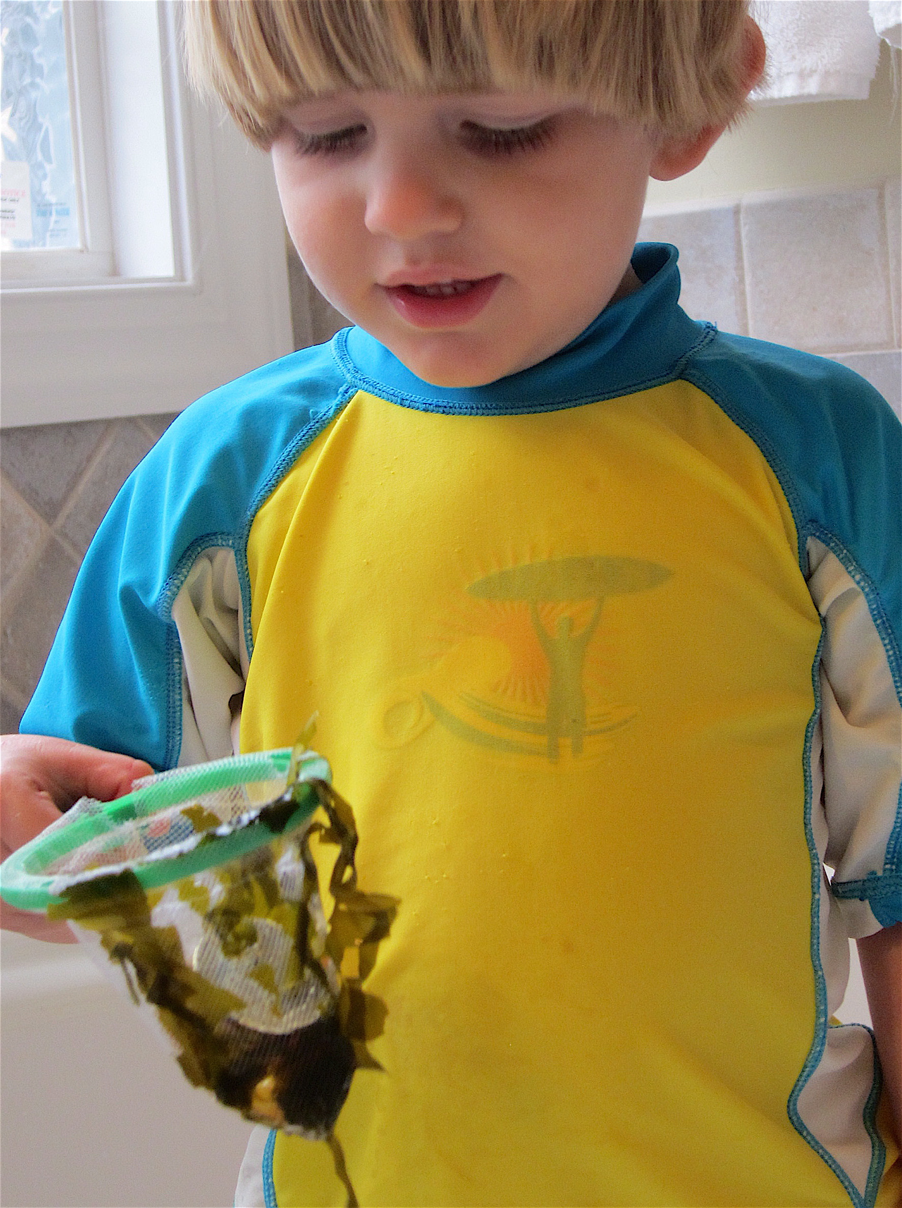 So, I bought some salad cut kelp (at Whole Foods) to help engage his interest so that he can learn to work with that slimy texture and not be quite so grossed out!