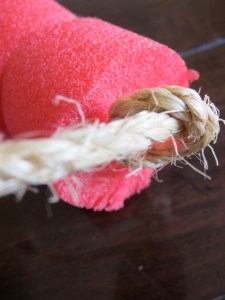 Skeletons are really some of the first images of anatomy that we see as children, especially around Halloween. So this is a great jumping off point for us. What is a skeleton and what is the backbone? I found this great idea to help answer these questions and decided to get started! All you need is a foam swimming noodle and some thick elastics for tying back hair into a pony tail. You cut the noodle into sections a couple of inches thick. And you’ll need a piece of rope to be the spinal cord.