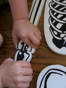 While I read the book to C., he set about working on this foam floor puzzle. And I love it. This will be a learning tool we’ll use for a long time as C’s understanding grows over the years. And yet the puzzle is simple enough that he can nearly complete it by himself! One the puzzle is complete, we sing the bones song as C points to each bone as its mentioned!