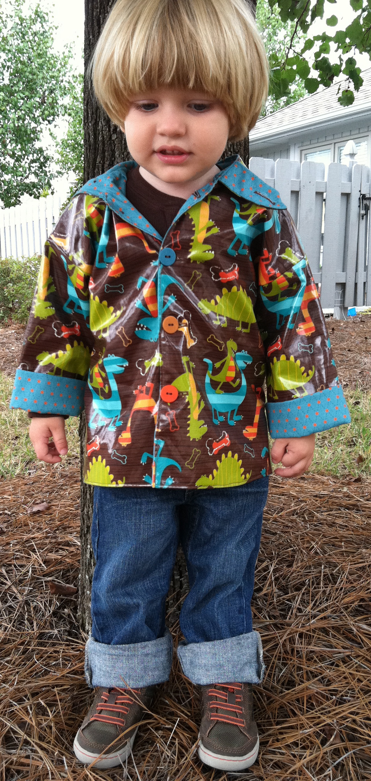 Michael Miller Dino Dudes in Rain Coat Published August 12, 2012 at 1231 × 2592 in Three Little Words that Have me Running to my Sewing Machine! This pattern is the Casey from Children’s Corner. Super simple and sweet.