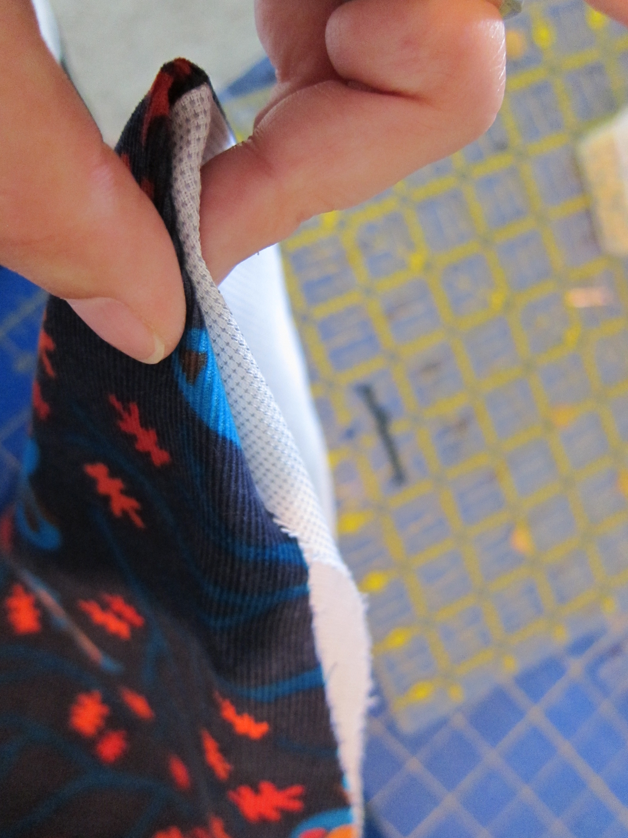STEP 5 – Now, the only raw edges left are those for the crotch. Simply fold the raw edges under, pin (matching center seams), and sew.