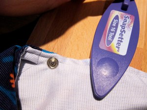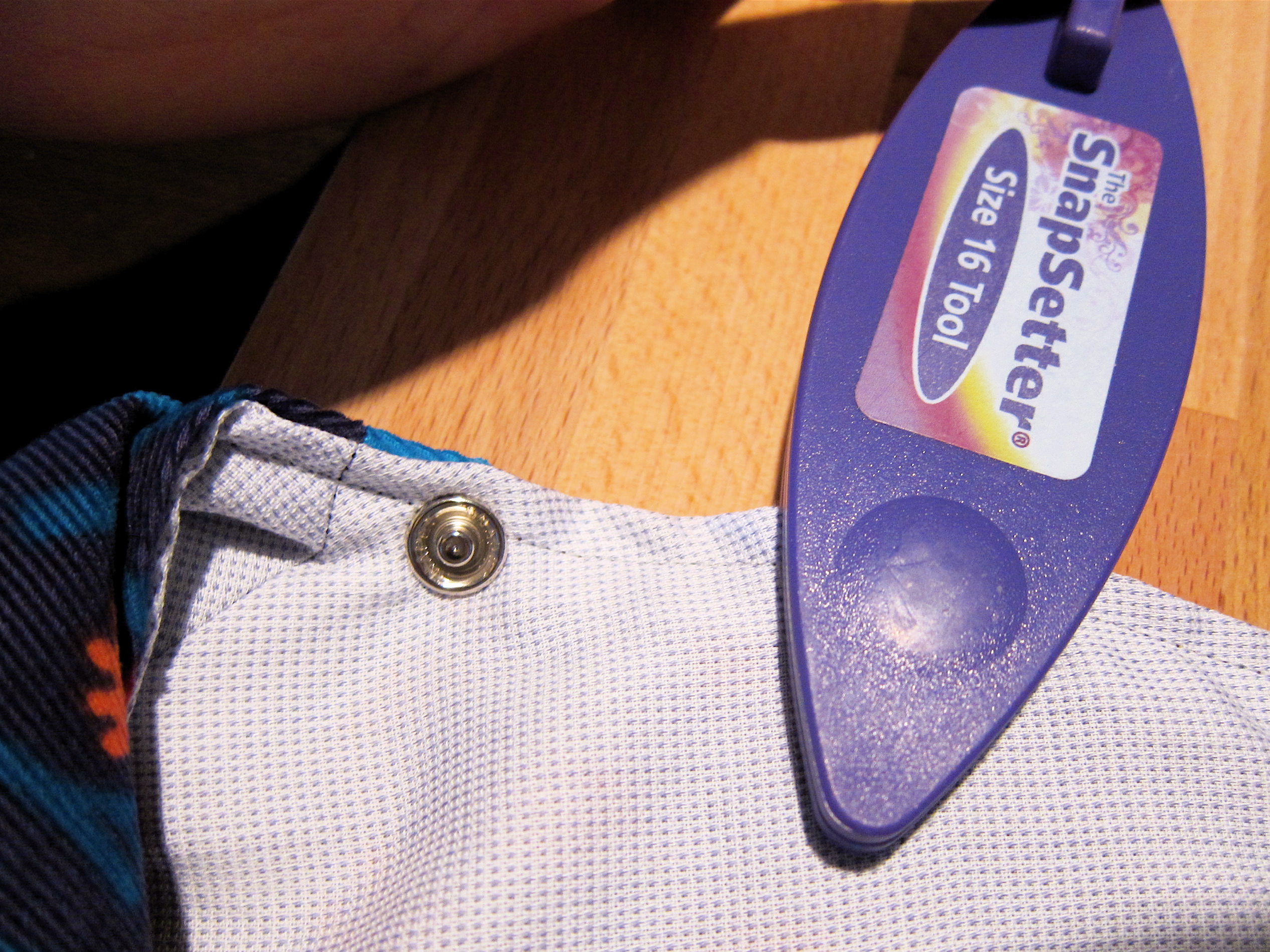 STEP 6 – Now you are ready to apply your snaps. I use the snap setter and size 16 long prong snaps. They offer full instructions on their website and on the package. For longalls, I apply 10 sets of snaps. For shortalls, I apply 4 sets.