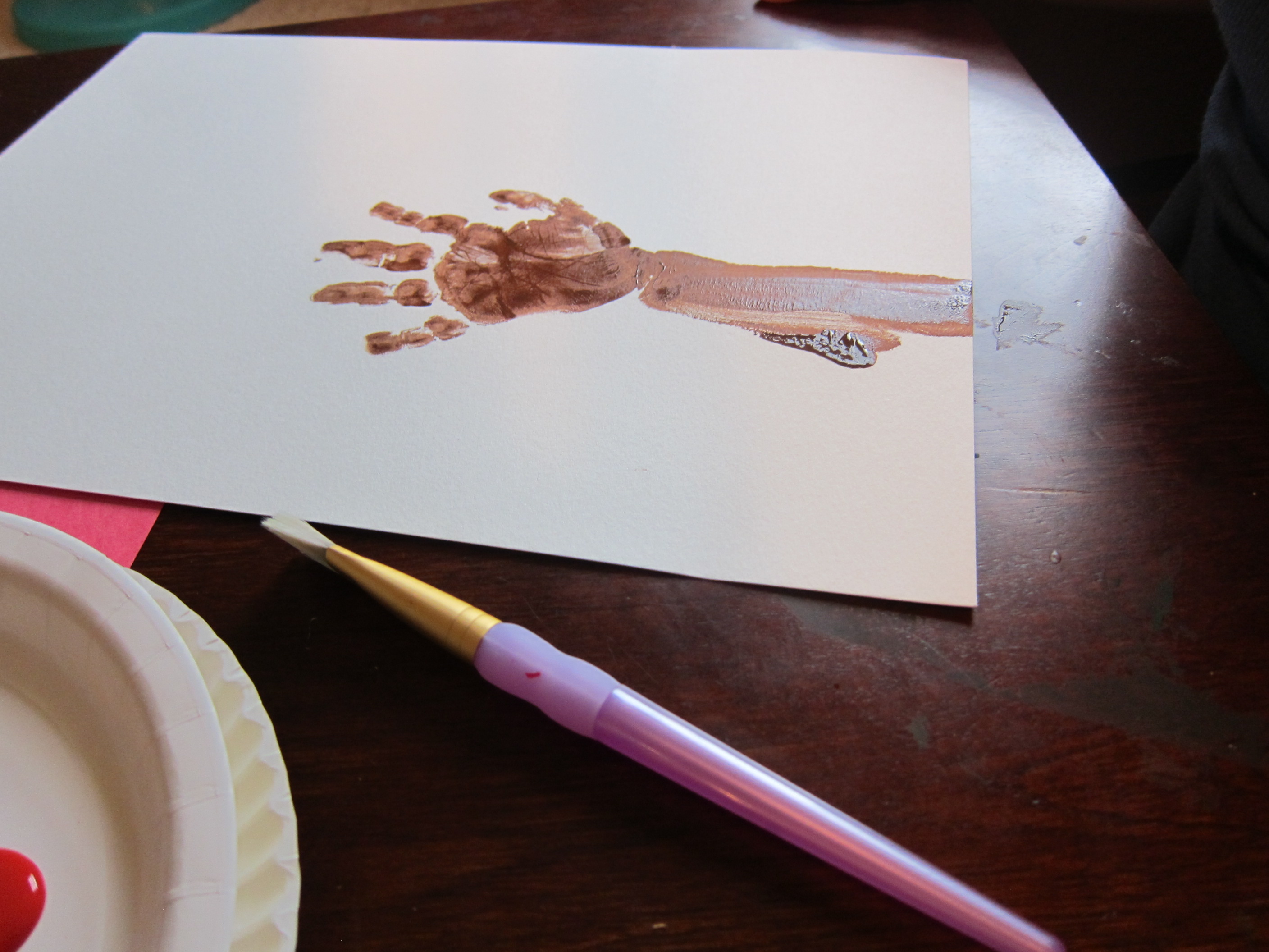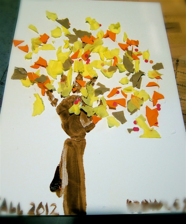He decided against thumb and finger prints for leaves and went with the plate of scraps.