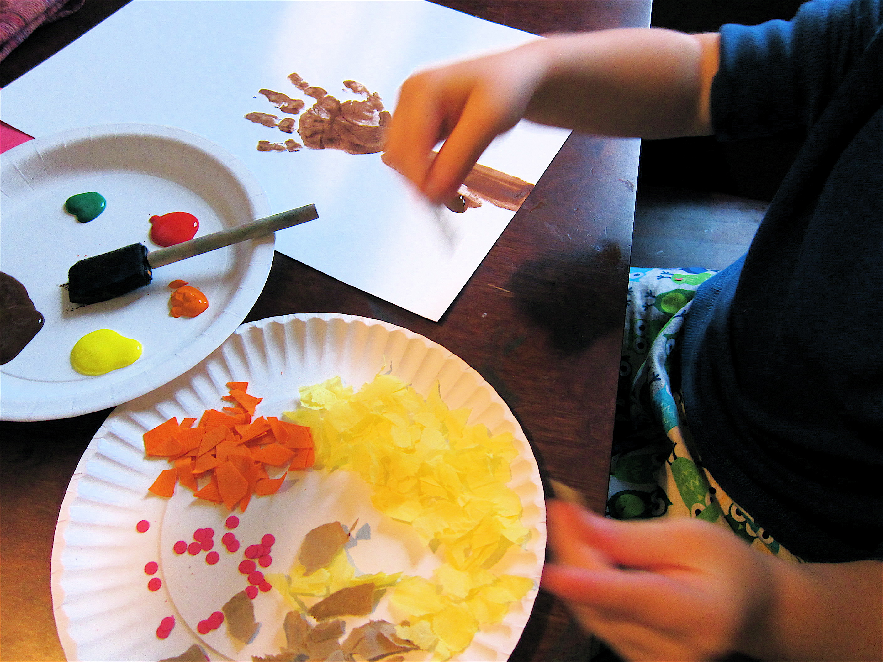 For the leaves, I gave C a palette of fall paint colors and another plate full of torn up tissue paper (leftover from our JetPack project), scraps of orange corduroy, pieces of a brown lunch bag, and for apples… we used hole punches from red construction paper. He LOVED working with the hole puncher!