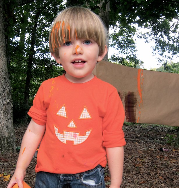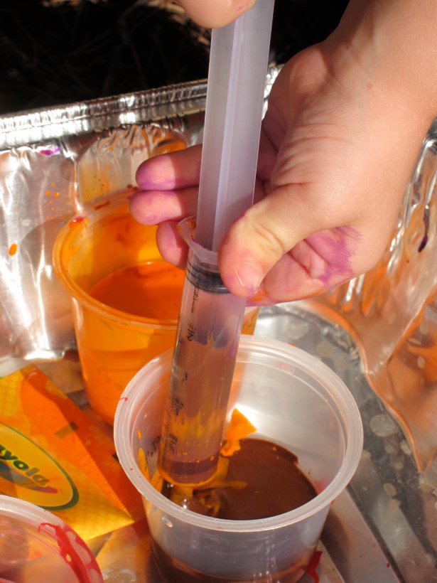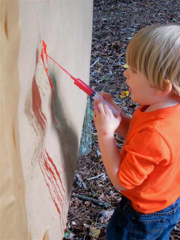 He also spent a lot of time trying to transfer paint from one squirt bottle to another. (Type-A alert – at first I started to say, “I don’t think that’s going to work,bud.” and then I quickly and silently told myself, “Shut up! Shut Up! Let him work with these materials any way he wants to. If it’s not going to work, let him figure that out.”