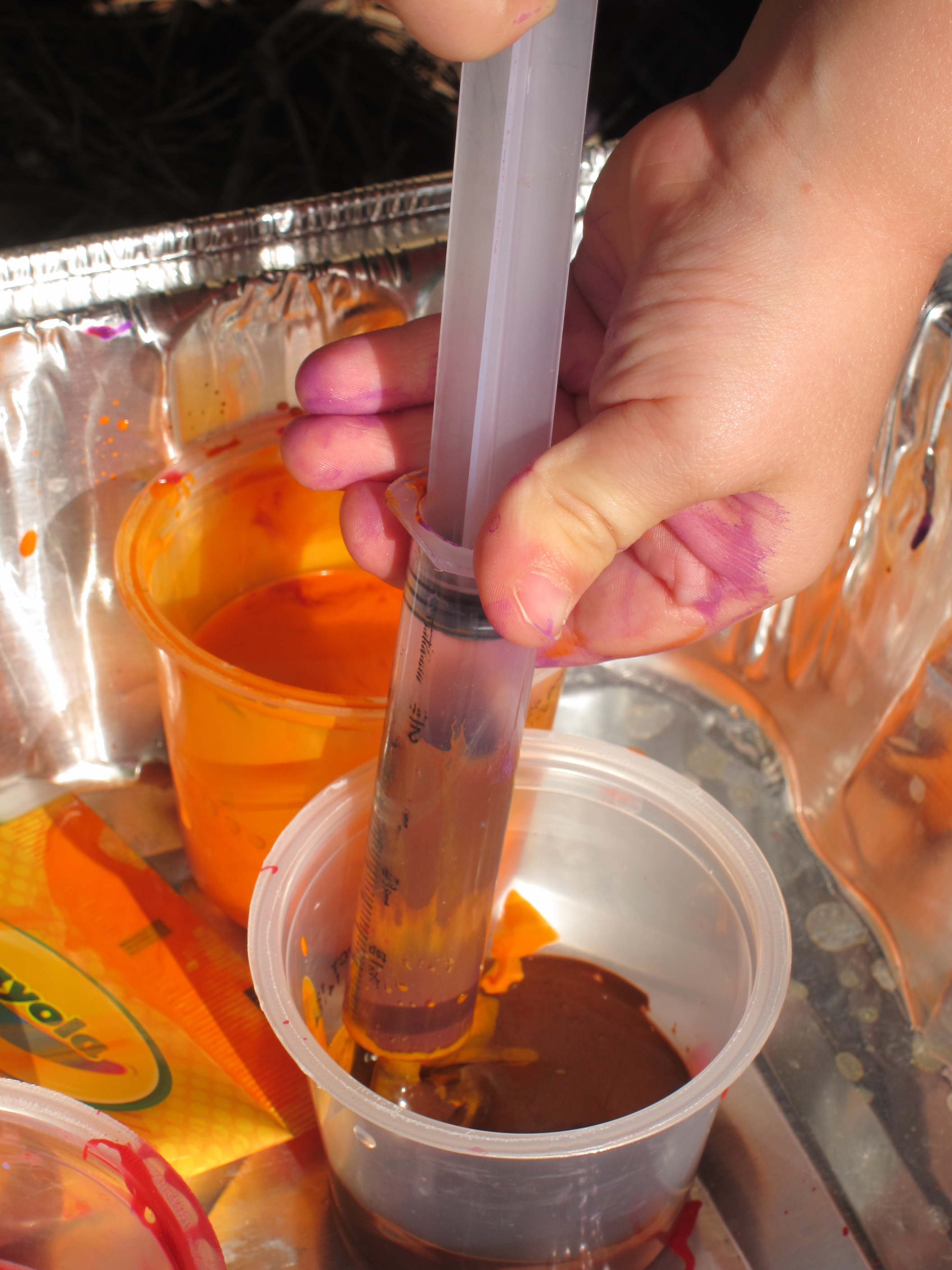 Using recycled apples sauce cups, I mixed our washable paint with water and set them in an aluminum roasting pan. Also in the pan is a variety of plastic syringes from our ice melt project and a spray bottle filled with watered down paint.