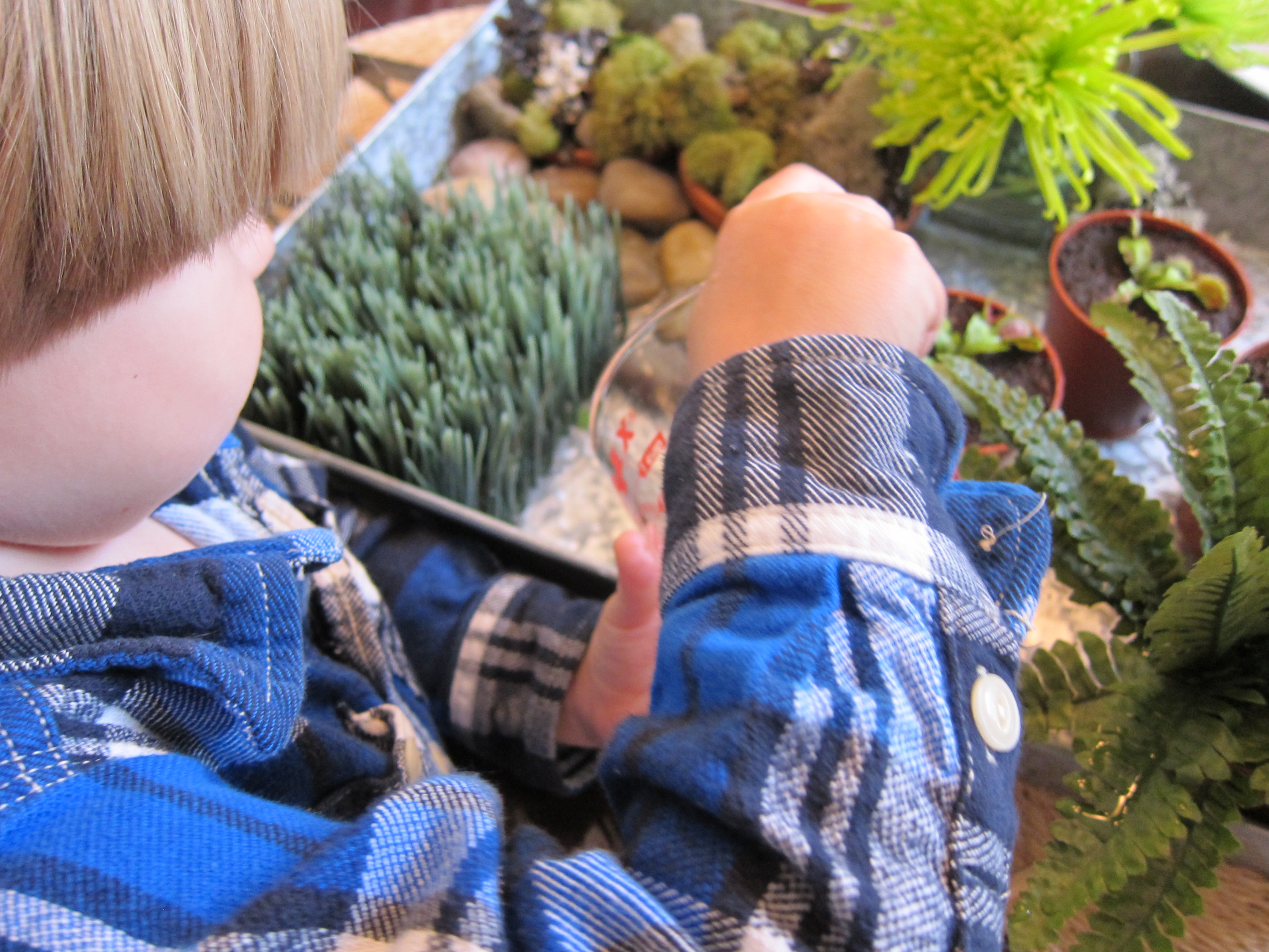 I set out the elements and the empty tray. C’s job was to create the habitat. This turned out to be a great opportunity for him to express his independence. He arranged all of the components in the tray as he wished.