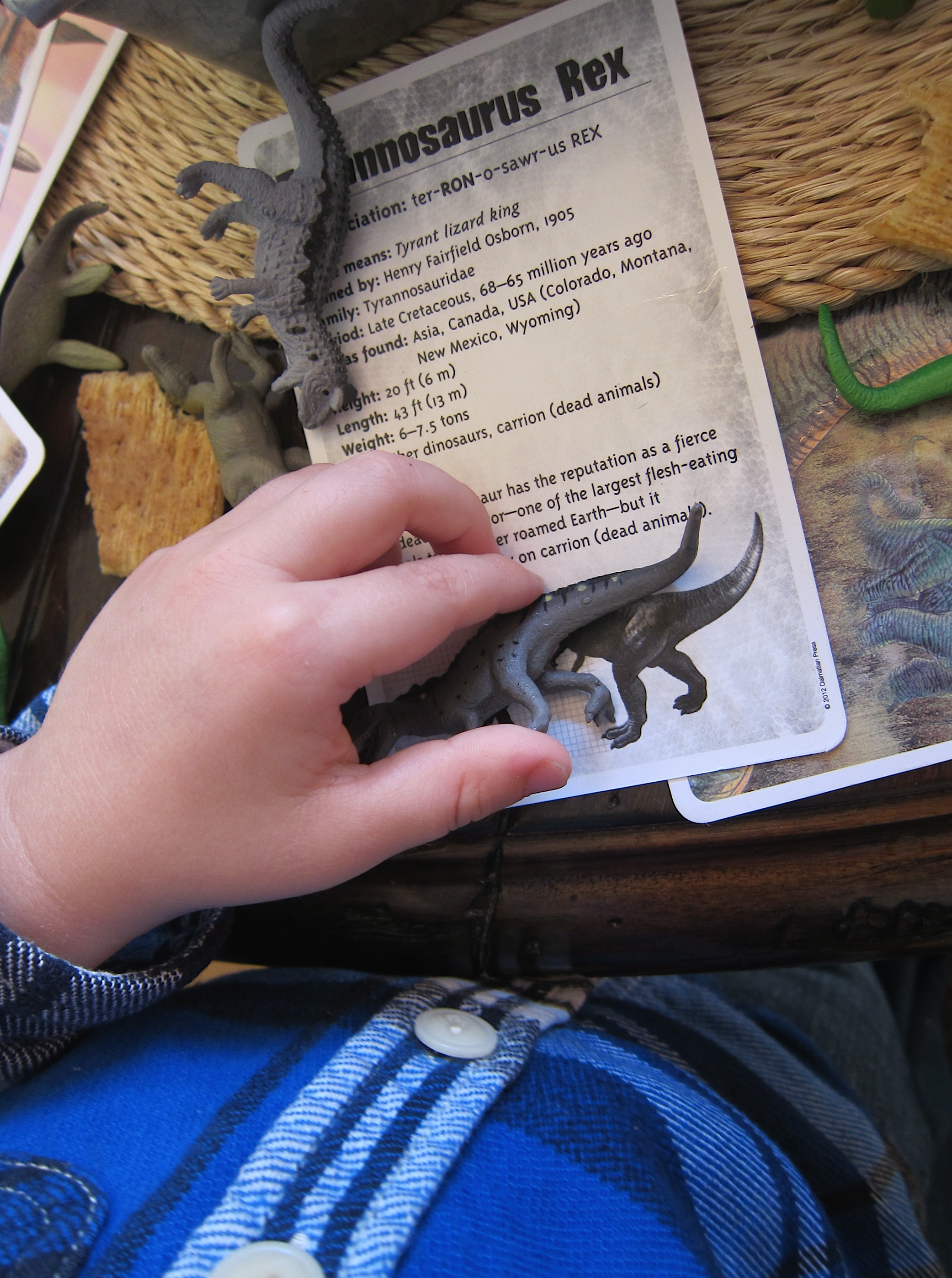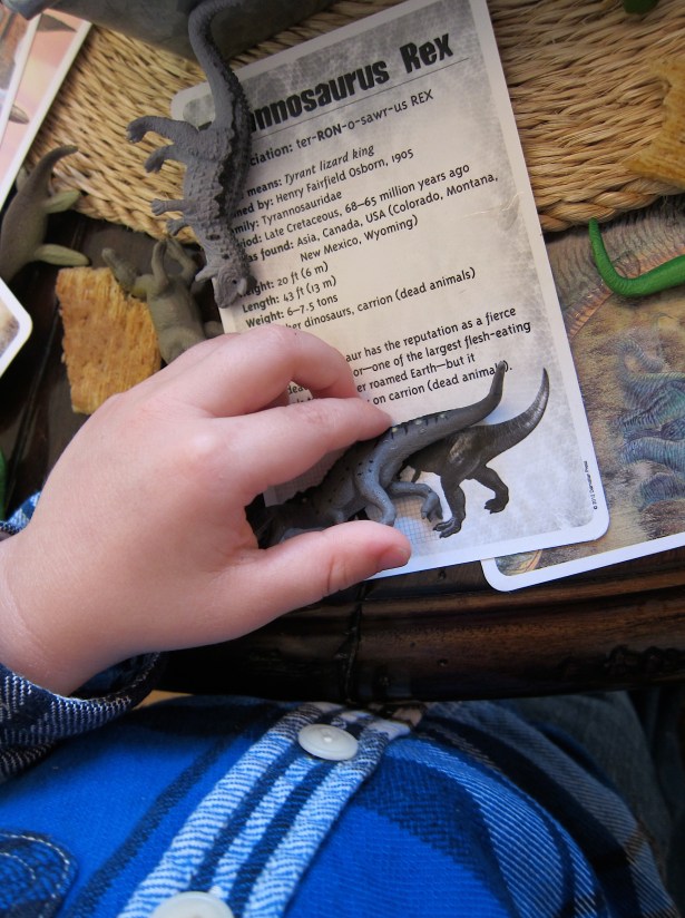 C. carefully compared the dinos in his habitat to those featured on the cards. This was a great problem solving activity and an opportunity to flex those observation skills… “does this one have two claws or three? Are the arms long or short? Is the tail big or small?”