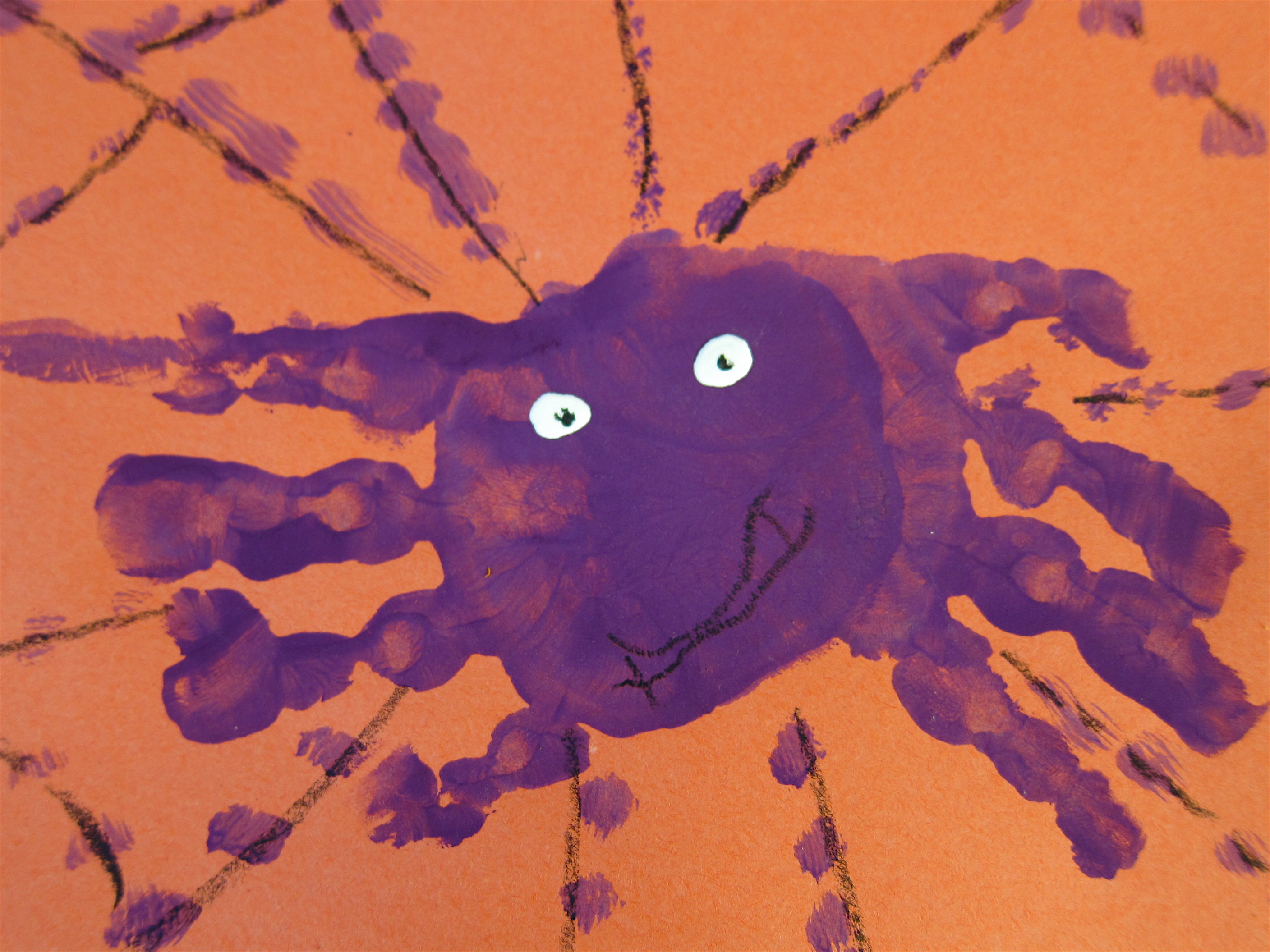 Meet our spooky spider – we painted the palm and four fingers and printed palm on top of palm for this arachnid. This is a great opportunity to have your preschooler figure out how many fingers must be painted to come up with eight legs for your spider. Have them come up with a theory and test it out until you get an eight legged friend.