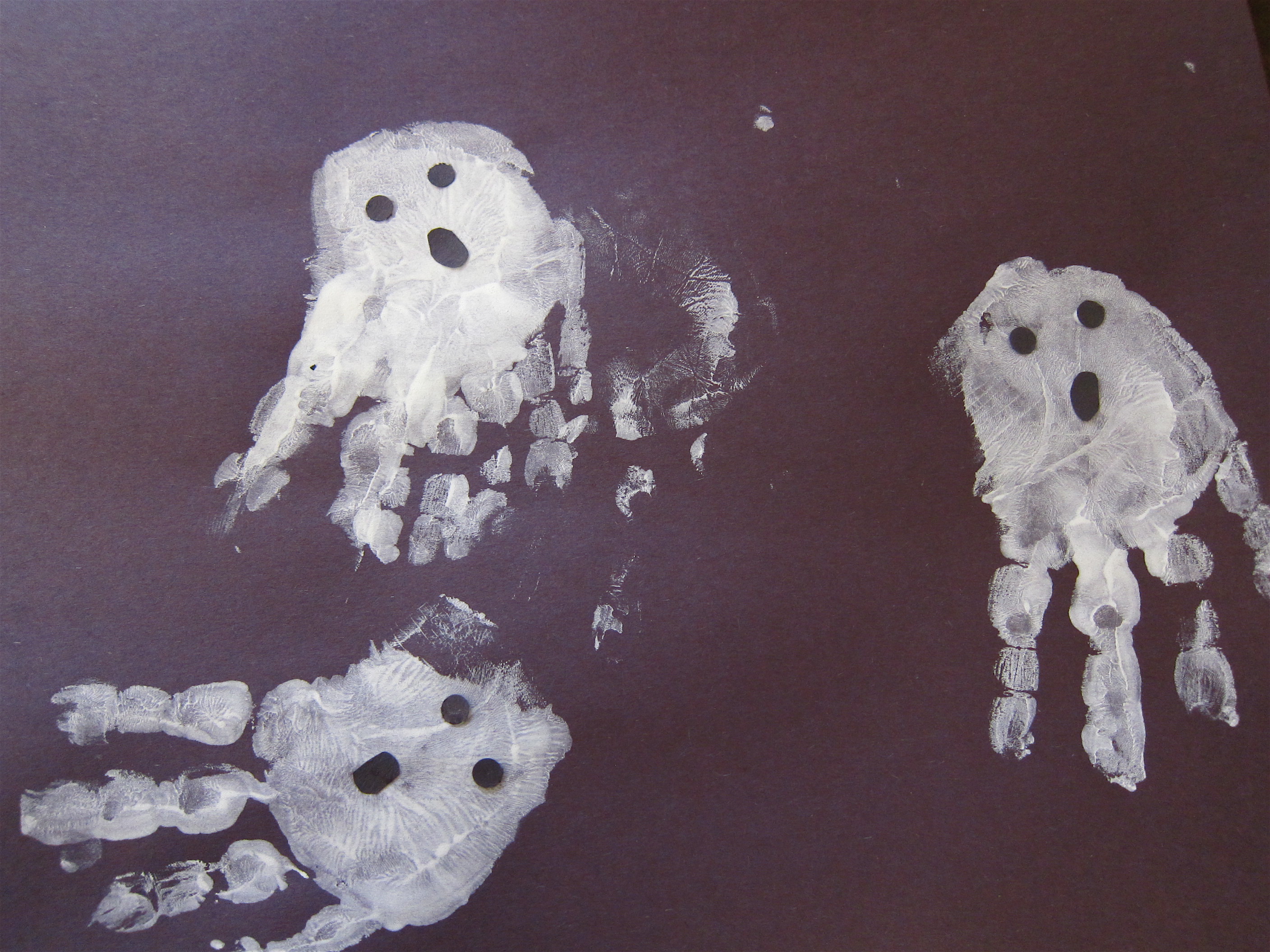 For the ghost, again just paint four fingers and palm. Black hole punches for the eyes and we cut on oval out for the mouth.