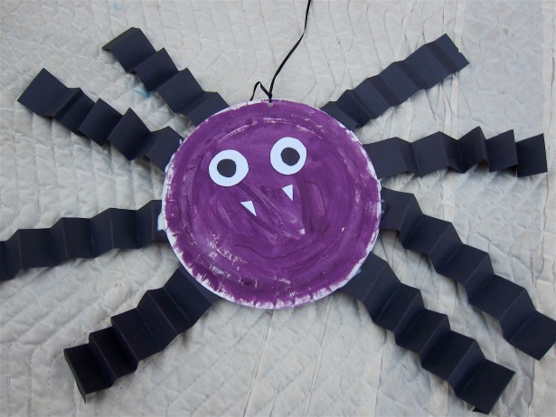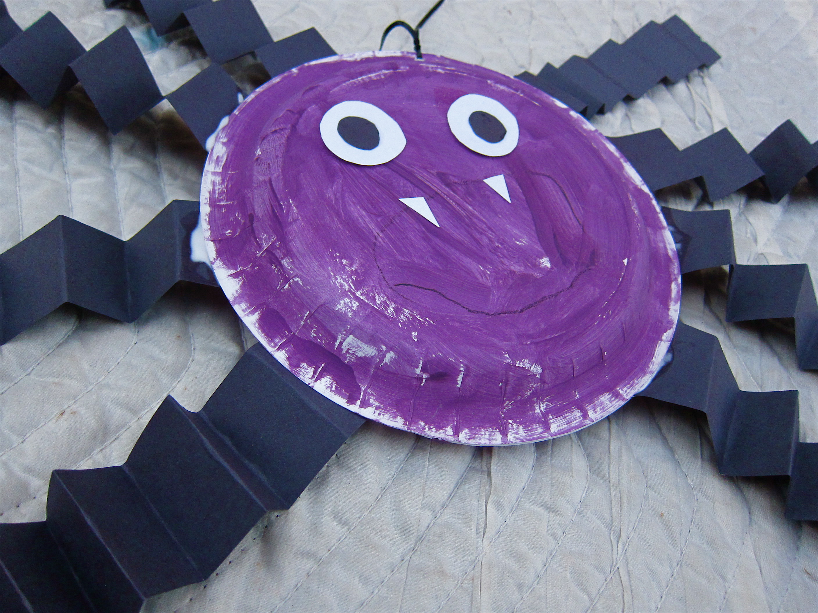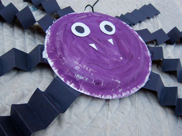 Paint the wrong side of the paper plates. Cut eight strips out of construction paper and fold accordion style. Cut out circles in white and black for your eyes. Assemble and display!