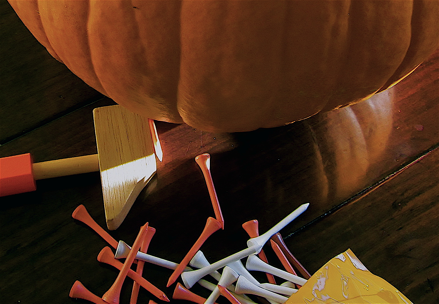 All you need is a pumpkin, golf tees and child’s play hammer.