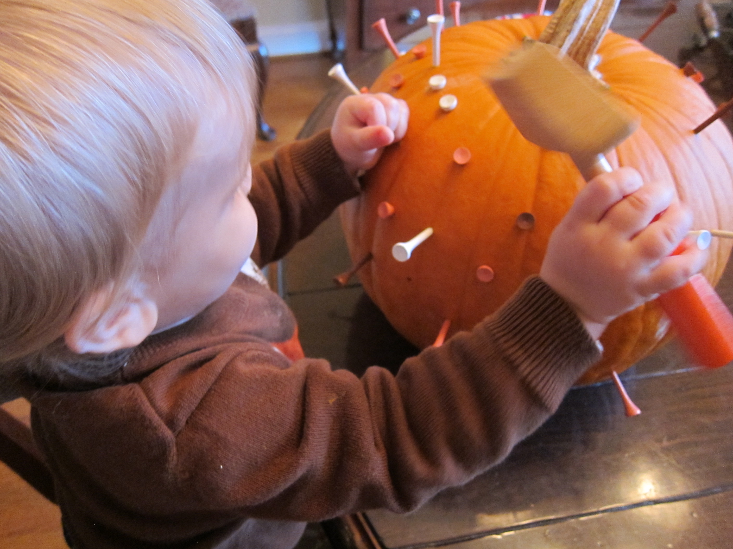 And so when I walked into C’s preschool class and saw him pounding golf tees into a pumpkin, it was like the clouds parted and the angels started singing. When the hammer hits the tee, it makes the quietest little thud. It’s almost a pleasant sound.