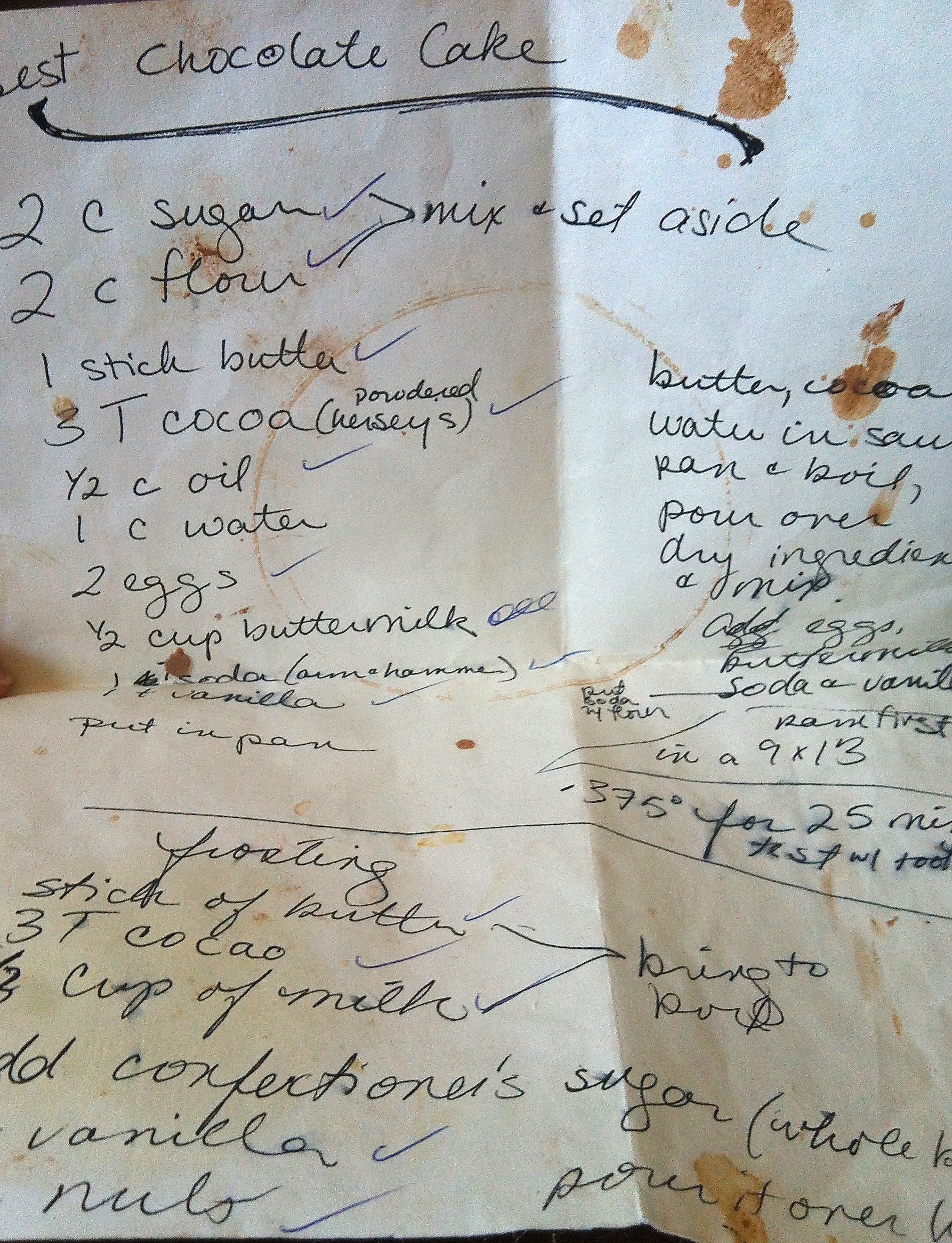 And so every time I grab that same sheet of paper to read the recipe, I find myself standing in one of my first apartments listening carefully to my grandmother. I hear her voice teaching me how to make a cake that will bring her great grandchildren so much joy many years later.